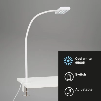 Die weiße Brilo Klemmleuchte der Serie Trasna eignet sich perfekt für Ihr Homeoffice. Sie kann durch ihre Klemme beliebig platziert und fixiert werden und bietet somit verschiedenste Montagemöglichkeiten. Die eingebaute Platine kommt mit einer Leistung von 7,5 Watt und 800 Lumen. Mit 6.500 K erstrahlt sie in hellem Tageslicht. Die Leuchte hat die Maße 805 mm x 230 mm x 40 mm.