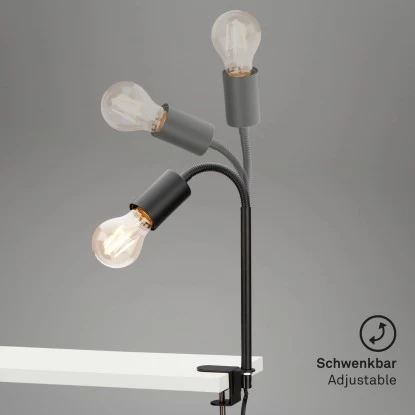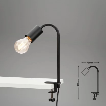 Die 1-flammige schwarze Briloner Retro-Klemmleuchte Krampo eignet sich hervorragend als Leselicht. Ob am Bett oder an einem Bücherregal, durch ihre Schraubklemme kann sie flexibel montiert werden. Über einen inkludierten Flexarm ist die Lichtposition individuell einstellbar. Die Leuchte wird ohne Leuchtmittel (1 x E27 max. 10 W) geliefert. Die Gesamtlänge streckt sich ohne Leuchtmittel auf 477 mm x 325 mm (H), Ø 42 mm (Kopf), Ausladung: 165 mm.