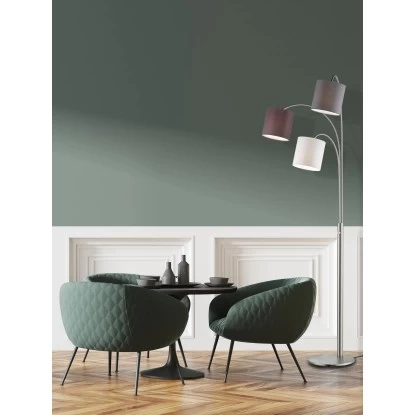 Diue Fischer & Honsel Stehleuchte Shade macht ihrem Namen alle Ehre. Sie kann frei im Raum platziert, neben die Sofalandschaft gestellt werden oder im Flur ankommende Besucher begrüßen. Die drei Lampenschirme sind an bogenförmigen Halterungen angebracht. Es entstehen gleichmäßige Lichtkegel als optimale Beleuchtung. Der Drehschalter ermöglicht eine einfache Bedienung der Leuchte. Das Design der Leuchte ist bewusst klassisch und dezent gehalten. Der Lampenfuß aus Metall in Nickelfarben matt sorgt für die nötige Stabilität. Die Lampenschirme sind stabilem Chintz Stoff gefertigt und lassen das Licht nur dezent in den Raum scheinen. Wenn der Tag zuneige geht und allmählich Ruhe einkehrt, dann können Sie es sich mit dieser Stehlampe so richtig gemütlich machen in Ihrem Zuhause. Richten Sie den Lichtkegel so aus und genießen Sie die warme Atmosphäre, die diese Leuchte erzeugt und fühlen Sie sich wohl. Mit einer Ausladung von 50 cm und einer Höhe von 190 cm ist dieser Artikel individuell platzierbar. Bestückt wird diese Wandleuchte mit 3 x E27 max. 40 Watt. Das Leuchtmittel ist im Lieferumfang nicht enthalten.