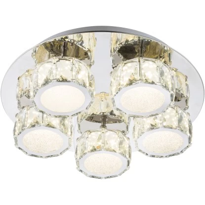 Diese edle und elegante LED-Deckenlampe Amur (Ø 40 cm) zeichnet sich durch hochwertige Materialien und edles Design aus. Die fünf zum Teil in verchromtem Metall eingefassten, satinierten Acryl-Spots, mit klaren und funkelnden K5-Kristallen, sorgen mit der passenden verspiegelten Deckenplatte für ein aufregendes Licht. Das inkludierte 40 Watt LED leistet 2800 Lumen starkes Licht bei einer neutralweißen Lichtfarbe (4.000 K).