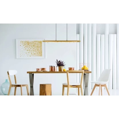 Diese Pendelleuchte aus der Felicitas-Serie (100×8 cm) besticht durch ihr simples Design aus messingfarbenem Metall. Sie besteht aus einem Metallstab, der an der Unterseite mit wunderschönen Acrylkristallen versehen ist und an zwei Kabeln bis zu 150 cm von der Decke hängt. Diese bedecken die inkludierten LED-Leuchtmittel, welche 980 Lumen starkes Licht bei einer angenehmen Lichtfarbe von 3000 Kelvin (warmweiß) leisten. Durch weitere Artikel der gleichen Serie können Sie das Gesamtbild in Ihren Innenräumen komplettieren.