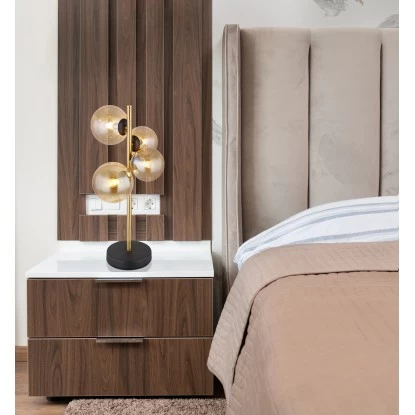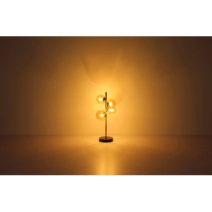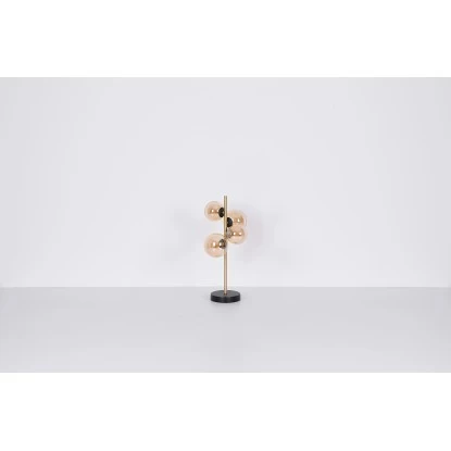 Diese faszinierende Tischleuchte der Serie Riha überzeugt durch tolles Design. Aus einem runden schwarz matten Sockel ragt eine 48 cm große Metallstange in schönen Messing, bestückt mit vier unterschiedlich großen G9 LED Leuchtmitteln und jeweils einem Glasschirm in Amber. Die G9 LED Leuchtmittel geben ein 3000 Kelvin warmweißes Licht ab und erschaffen somit eine angenehme Atmosphäre. Durch weitere Modelle dieser Serie können Sie Ihren Wohnbereich perfekt ergänzen.