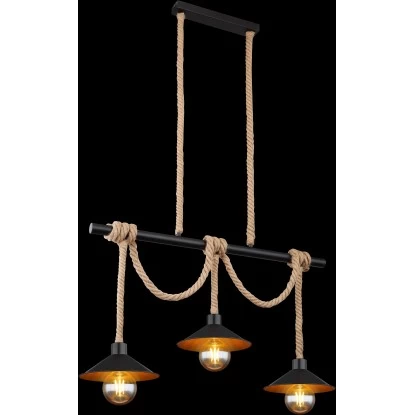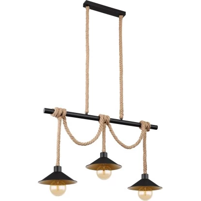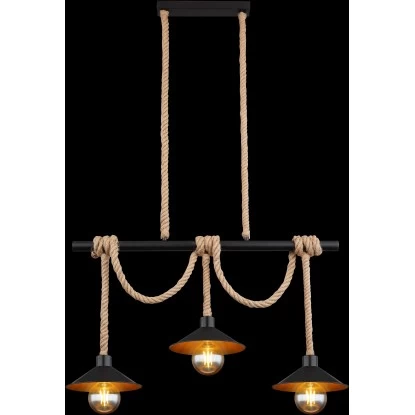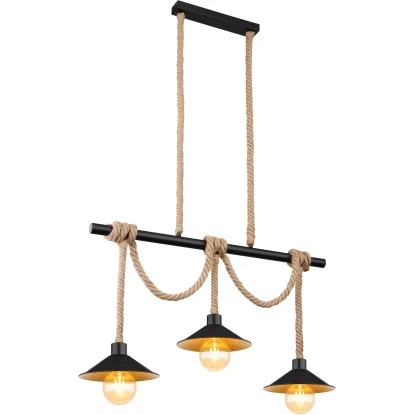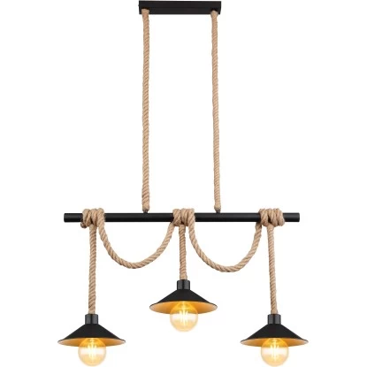 Die zeitlose Pendelleuchte Diana begeistert durch ihr schönes Design und wird zum Mittelpunkt Ihres Wohnbereiches. Die Leuchte besteht aus drei Schirmen (Ø22 cm) mit goldener Innen- und schwarzer Außenseite welche an schön geflochtenen Hanfseilen bis zu 1,2m von der Decke hängen und an einem schwarzen Holzstamm mit einer Länge von knapp 83 cm umwickelt und somit gekürzt werden können. Bestehend aus vier E27 Fassungen überlässt Ihnen die Leuchte, bis zu einer maximalen Leistung von 60 Watt, die freie Wahl über das Leuchtmittel.