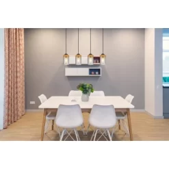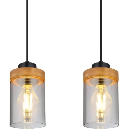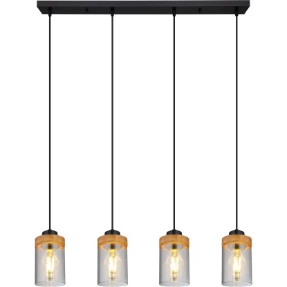 Diese wunderschöne Pendelleuchte begeistert durch tolles Design. Vier E27 Fassungen hängen jeweils an einem schwarzen Kabel bis zu 1,5m von der Decke und münden in einer schwarz matten länglichen Verkleidung (80 cm). Auf den E27 Fassungen befindet sich jeweils ein zylinderförmiger Schirm in Rauchfarben und Holzverzierungen. Die E27 Fassungen ermöglichen Ihnen Leuchtmittel Ihrer Wahl, bis zu einer maximalen Leistung von 60 Watt, zu benutzen.