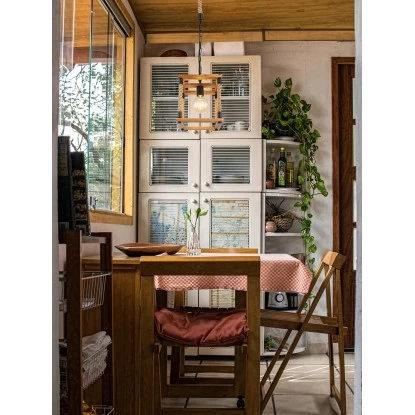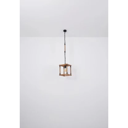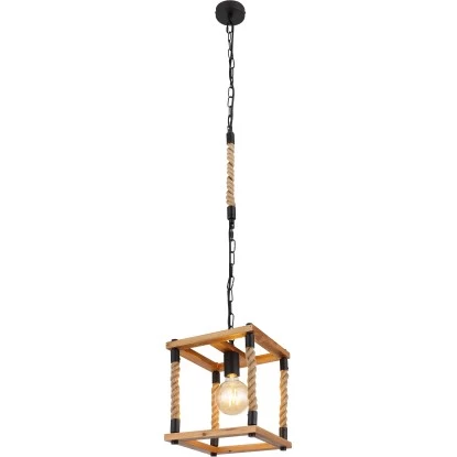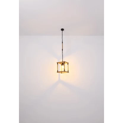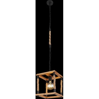 Diese schöne Deckenleuchte beeindruckt durch ihr tolles Design. In einem 25×25 cm großen Holzgerüst mit Hanfseil Verzierungen befindet sich eine E27 Fassung, welche an einer Kette 1,2m von der Decke hängt. Die E27 Fassung ermöglicht Ihnen die freie Auswahl, bis zu einer maximalen Leistung von 60 Watt, Ihrer Leuchtmittel.