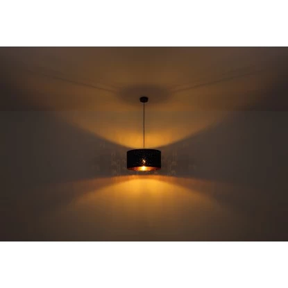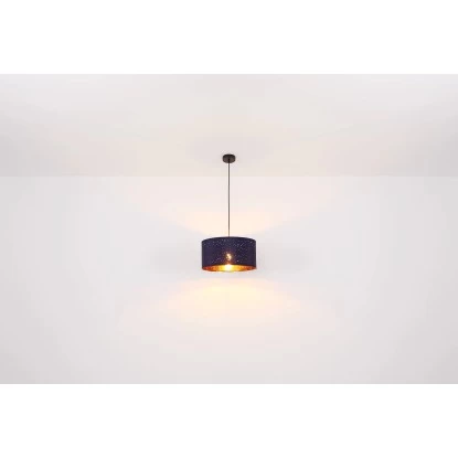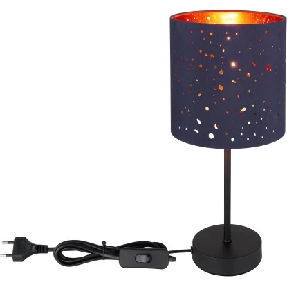 Diese wunderschöne Tischleuchte begeistert durch ein tolles Design. Aus einem schwarzen runden Sockel ragt eine 35 cm lange Metallstange und mündet an einer E27 Fassung. An der E27 Fassung befindet sich ein blauer Schirm (Ø 15 cm) mit Musterstanzungen und kupferfarbener Innenseite. Die E27 Fassung ermöglicht Ihnen bis zu einer maximalen Leistung von 40 Watt, selbst über Lichtfarbe und Helligkeit zu bestimmen. Aufgrund von Langlebigkeit und Stromersparnis empfehlen wir LED Leuchtmittel.