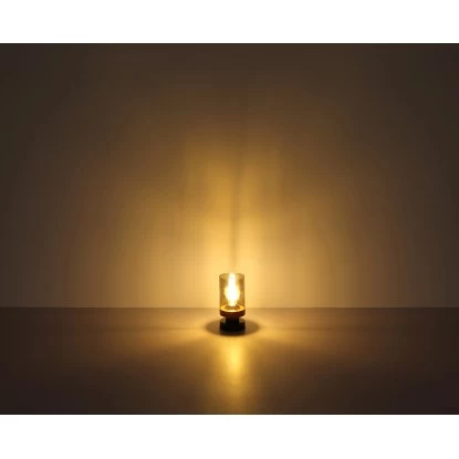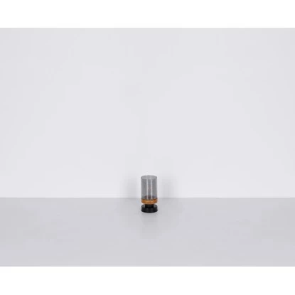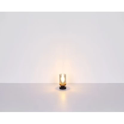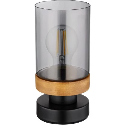 Ein moderner Hingucker für jeder Ihrer Räume. Die wunderschöne Tischleuchte mit zylinderförmigen rauchigem Glasschirm (Ø10 cm) und Holzverzierungen besitzt eine E27 Fassung, welche sich auf einem schwarz matten Sockel befindet. Die E27 Fassung ermöglicht Ihnen die freie Wahl, bis zu einer maximalen Leistung von 60 Watt, Ihrer Leuchtmittel.