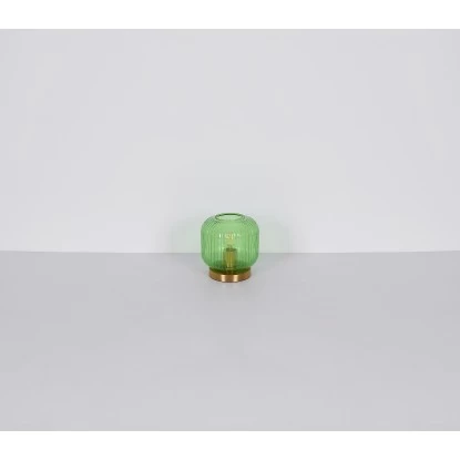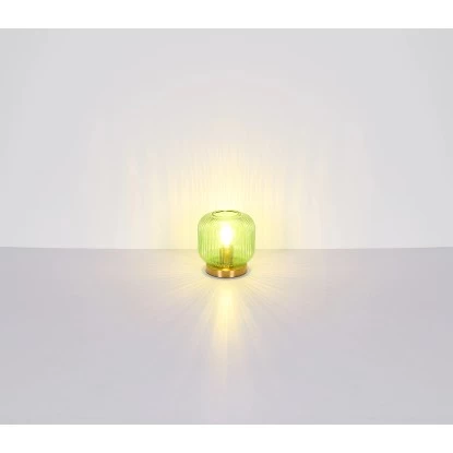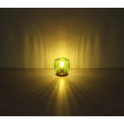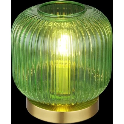 Diese dekorative Tischleuchte begeistert durch schönes Design. Auf einem messingfarbenen Metallsockel befindet sich mit einem Durchmesser von 20 cm ein formschöner Glasschirm in Grün. Eine E27 Fassung im Inneren ermöglicht Ihnen, bis zu einer maximalen Leistung von 60 Watt, selbst über Lichtfarbe und Helligkeit zu bestimmen. Setzen Sie Akzente in Ihrem Wohnbereich.