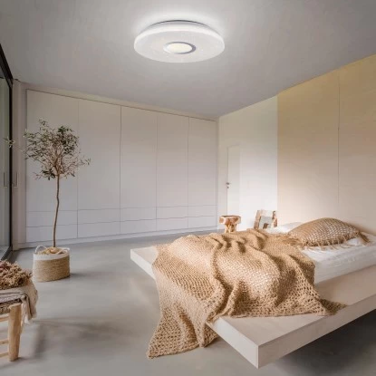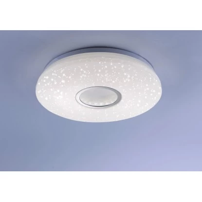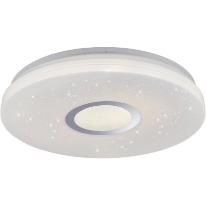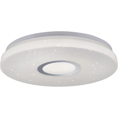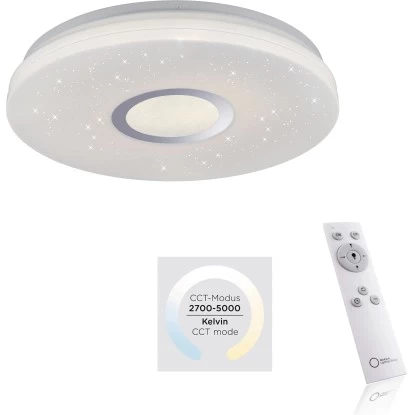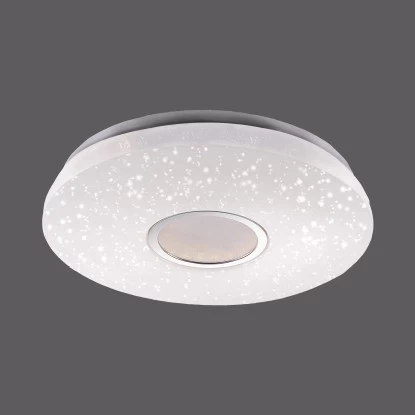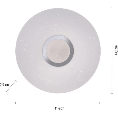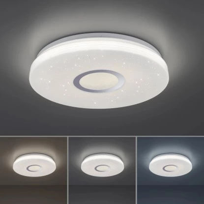 Die runde Deckenleuchte Jonas überzeugt mit Ihrer faszinierenden Sternenhimmel-Optik. Stellen Sie sich vor, Sie sitzen an einem lauen Sommerabend im Garten, auf dem Balkon oder auf einer Wiese im Grünen und Sie schauen in die Sterne. Welch beruhigendes, erholsames Gefühl sich dann in einem ausbreitet. Die Ruhe, der verzaubernde Anblick. Mit der Jonas Deckenleuchte steht Ihnen nun die Möglichkeit offen ganz einfach einen Sternenhimmel in Ihre vier Wände zu holen. Sie wird aus einer Kombination aus Stahl und Kunststoff gefertigt und durch die vielen, kleinen lichtdurchlässigen Punkte in dem Glasschirm wirkt es als würden kleine Sterne funkeln. Sie wird inklusive einem festverbauten 17,2 Watt LED-Leuchtmittel geliefert. Das Leuchtmittel strahlt rund gemessene 2420 Lumen aus und Sie haben die Möglichkeit, die Leuchte in ihrer Lichtfarbe von Warmweiß (3.000 Kelvin) bis Tageslichtweiß (5.000 Kelvin) sowie in die Lichtstärke zu verändern. Diese Regulierung erfolgt über die Fernbedienung, die bei dieser Leuchte im Lieferumfang enthalten ist. Die Leuchte mit einem Durchmesser von 41,6 cm ist vielseitig einsetzbar und findet garantiert einen besonderen Platz in einem Ihrer Wohnräume. Lassen Sie sich von dem schönen Sternenhimmel verzaubern.