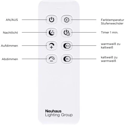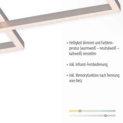 Ausgestattet mit einem integriertem CCT-Lichtmanagement besteht die Möglichkeit die Deckenlampe in der Farbtemperatur von warmweiß (2700 Kelvin) bis tageslichtweiß (5000 Kelvin) zu verstellen. Die Regulierung der Lichtfarben erfolgt über die mitgelieferte Infrarot Fernbedienung. Ebenfalls kann man stufenlos die Lichtstärke per Infrarot-Fernbedienung ganz nach Belieben verändern.