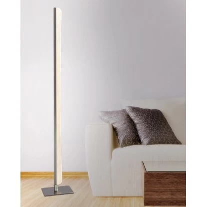 Bones 2 ist eine LED-Stehleuchte, die ihr warmweißes Licht durch einen satinierten Acrylglas-Schirm hindurch an ihre Umgebung abgibt. Gehalten wird das rechteckige Glaselement von einer glänzenden, chromfarbenen Halterung. 108 LEDs verteilen sich auf den schmalen Acrylkörper und geben ein gleichmäßiges Licht ab. Mit einer Gesamthöhe von 125 cm ist diese stilvolle Stehleuchte ein wahrer Blickfang.