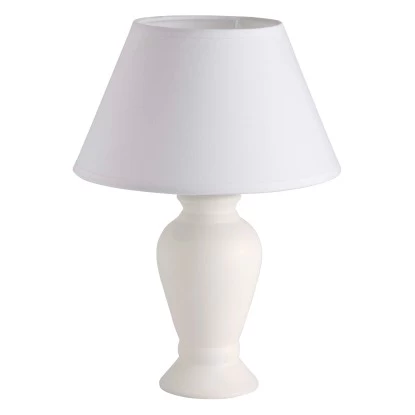Klassische Tischleuchte für Wohn- und Schlafzimmer. Der Stoffschirm sorgt für eine blendfreie Beleuchtung des Raumes. Die Leuchte ist für den Einsatz von Energiesparlampen geeignet. Die Leuchte ist mit einem E14 Sockel für maximal 40 Watt ausgelegt.