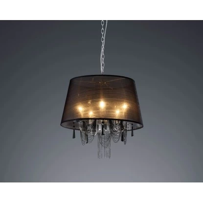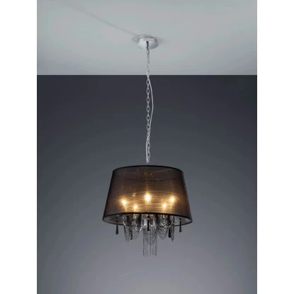 Mit diesem edlen, 5-flammigen Kronleuchter in Charleston-Stil sorgen Sie für ein besonderes Ambiente in Ihren Räumen. Die Leuchte hat einen chromfarbenen Baldachin und einen schwarzen Gewebeschirm mit einem Durchmesser von ca. 50 cm. Die Leuchte ist mit fünf E14 Fassungen für jeweils maximal 40 Watt ausgelegt. Die passenden Leuchtmittel sind separat erhältlich.