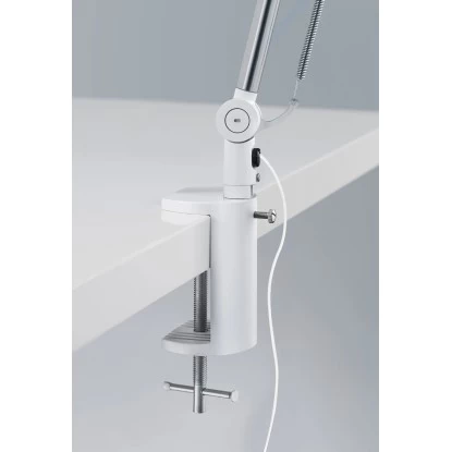 Die Tischlampe bietet neben dem Standardfuß zwei weitere Montagemöglichkeiten. So kann die Tischleuchte an der Wand befestigt oder als Klemmleuchte direkt am Tisch montiert werden. Die Leuchte hat eine Höhe von 70 cm und eine Auslage von 38 cm. Die Tischleuchte ist aus Metall gefertigt und überzeugt in der Farbe weiß/grau im klassischen Design.