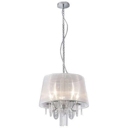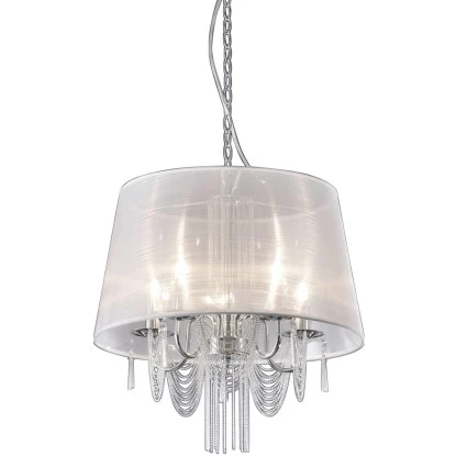 Mit diesem edlen 5-flammigen Kronleuchter in Charleston-Stil sorgen Sie für ein besonderes Ambiente in Ihren Räumen. Die Leuchte hat einen chromfarbenen Korpus und einen weißen Gewebeschirm mit einem Durchmesser von ca. 50 cm.